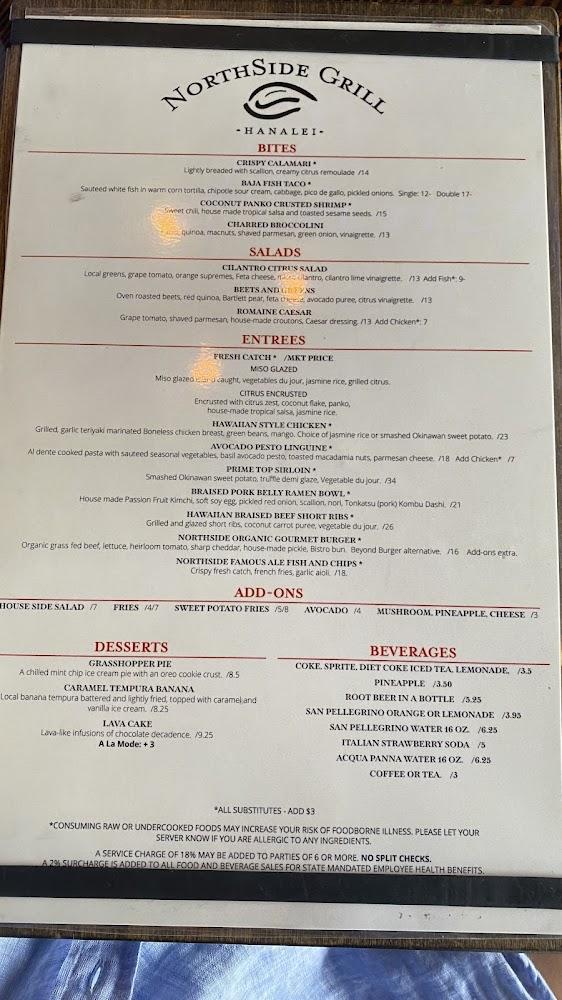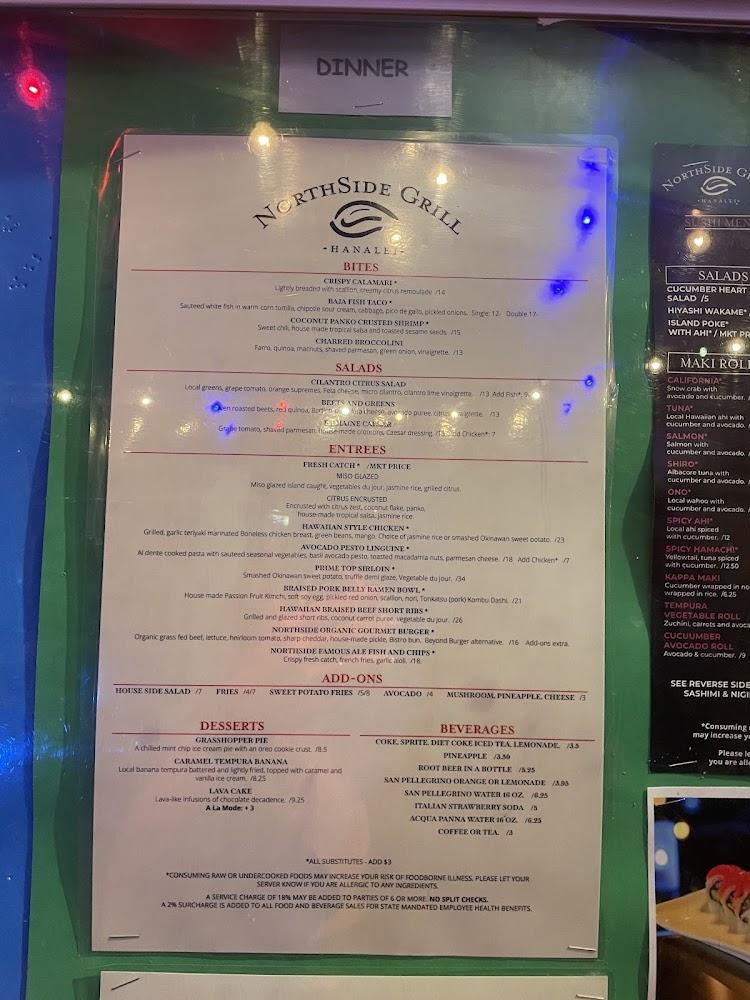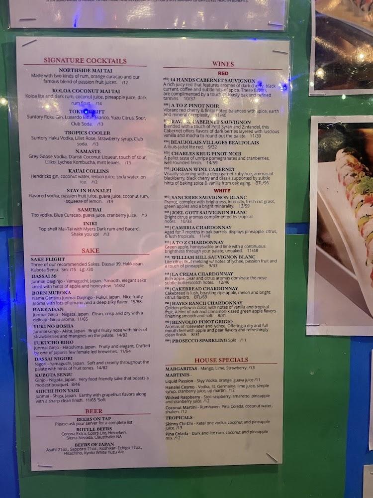Northside Grill features an eclectic menu that showcases Asian and American cuisine. Signature sushi rolls, like the Sunrise Roll and Crunchy Shrimp roll, highlight creativity and freshness. Entrées range from Citrus Fresh Fish of the Day to Hawaiian Style Chicken, each bursting with flavor. Vegetarian options include Avocado Pesto Linguine, appealing to plant-based diners. Prices are reasonable, with an overall average of around $24 per dish. Diners enjoy small plates for sharing and unique items like the Northside Famous Ale Fish and Chips. Desserts and beverages elevate the dining experience, creating a perfect end to every meal.